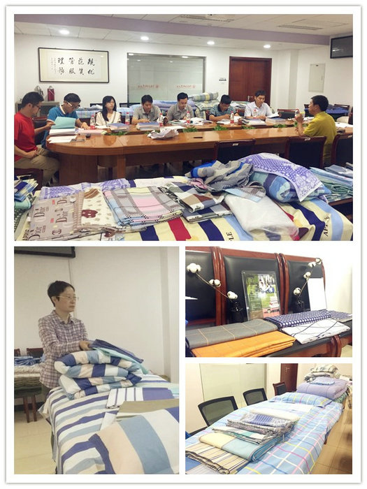 在会上投标企业分别做了产品展示和产品报价。各位标委现场仔细查看投标企业的床上用品布料质量、花色品种等,并根据投标企业的情况进行提问,最终经投票选定两家企业作为学校新生入学床上用品官方指定销售方。2017年迎新期间,新生可通过“后勤微信迎新系统”或到销售现场自愿选择购买。