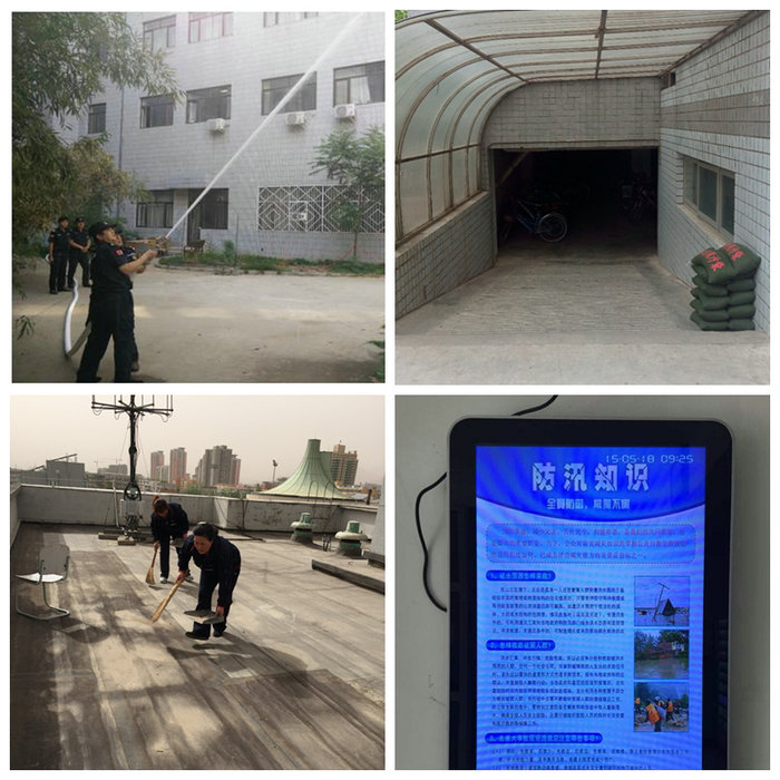 后勤管理处作为学校防汛工作的具体组织和实施单位,以提高汛期学校预防和应对突发灾害的能力为重点,对全校防汛重点部位进行了安全隐患排查,建立了《防汛安全隐患台账》;成立了防汛应急抢险队,在校园各重点防汛部位放置沙包、抽水设备、雨具等防汛物资;对《中国免费靠逼视频(北京)防汛工作预案》进行了完善修订。后勤各实体公司均进行了安全隐患自查并制订了应对各类潜在灾害风险的应急预案。动力维修公司、公寓服务公司和润杰物业公司组织人员对校园建筑物屋顶、雨水口进行了全面清理,协助气象部门对楼宇避雷设施进行检测,确保汛期的校园安全。各学生公寓、食堂利用条幅、宣传海报、LED屏等,向学生宣传预防地质灾害、消防安全等知识。