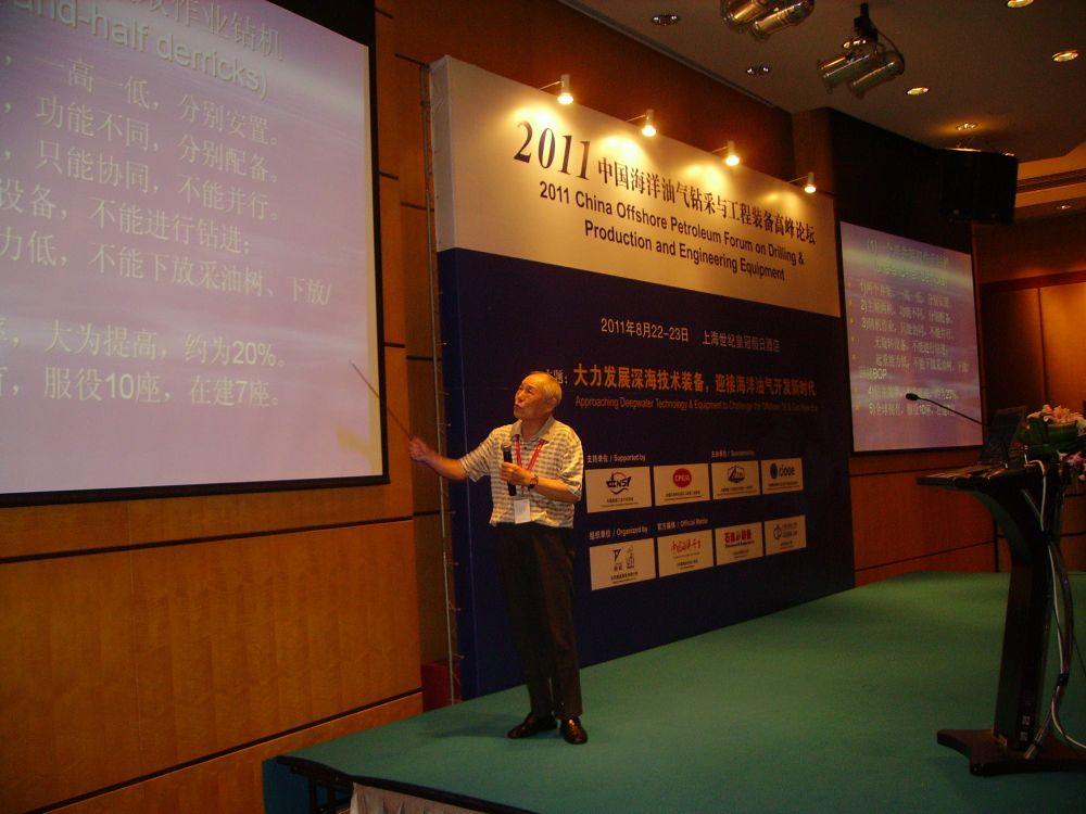 2011年,方华灿在上海参加中国海洋油气钻采与工程装备高峰论坛时作学术报告。新华社发