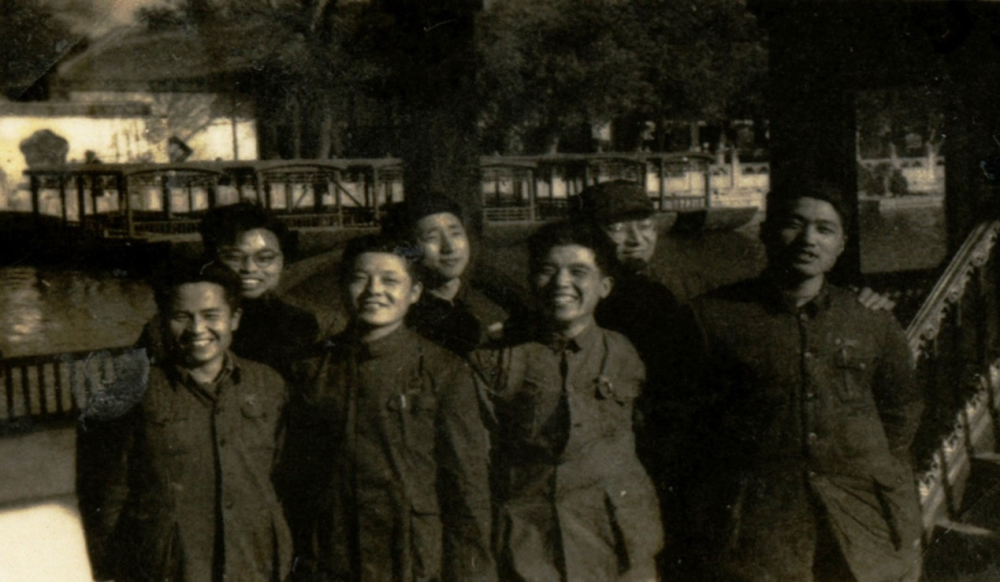 1952年在清华大学石油系与系内部分青年教师合影(前排左二为方华灿)。新华社发