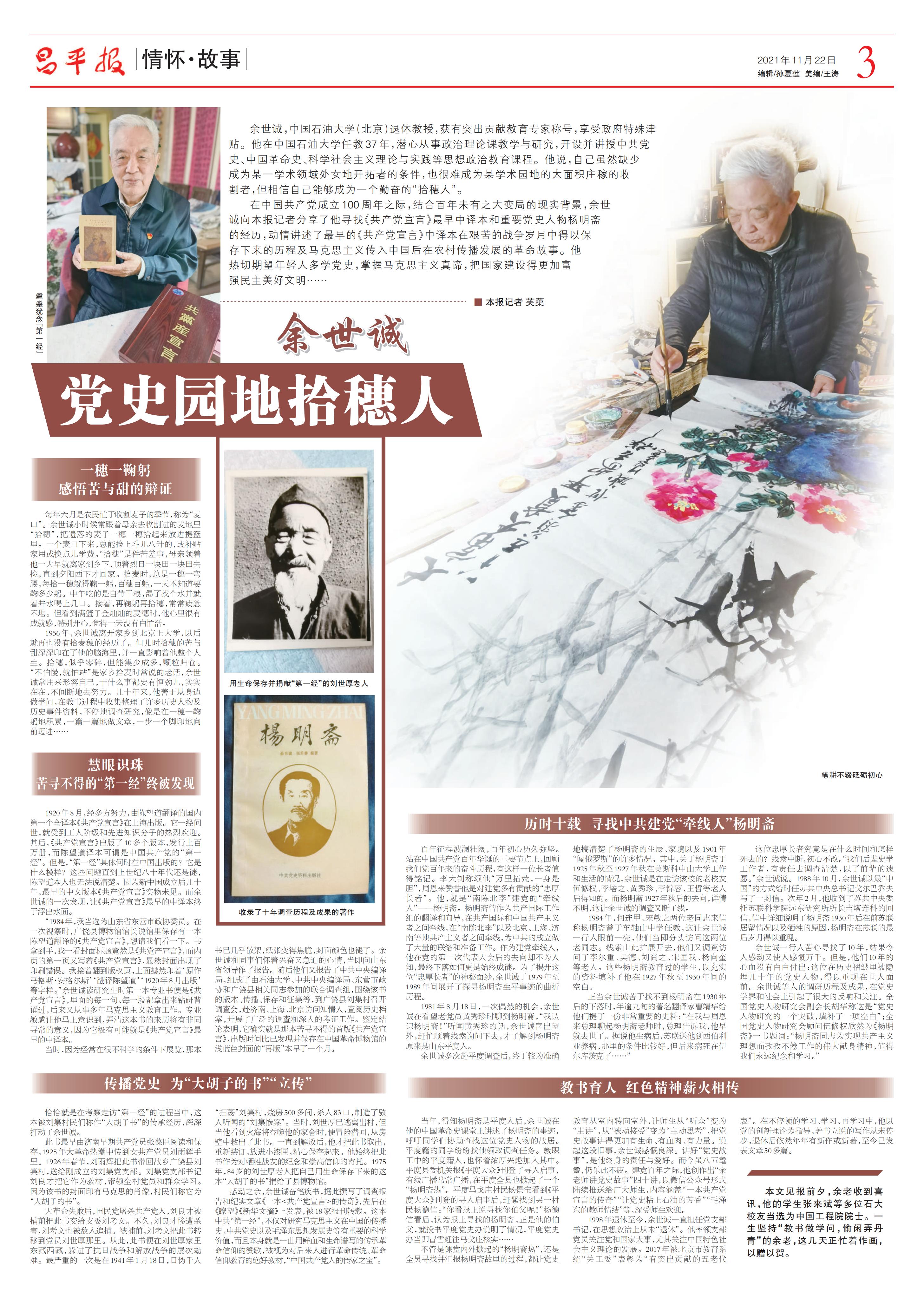 不管是课堂内外掀起的“杨明斋热”,还是全员寻找并汇报杨明斋故里的过程,都让党史教育从室内转向室外,让师生从“听众”变为“主讲”,从“被动接受”变为“主动思考”,把党史故事讲得更加有生命、有血肉、有力量。说起这段旧事,余世诚感慨良深。讲好“党史故事”,是他终身的责任与爱好。而今虽八五耄耋,仍乐此不疲。建党百年之际,他创作出“余老师讲党史故事”四十讲,以微信公众号形式陆续推送给广大师生,内容涵盖“一本共产党宣言的传奇”“让党史粘上石油的芳香”“毛泽东的教师情结”等,深受师生欢迎。