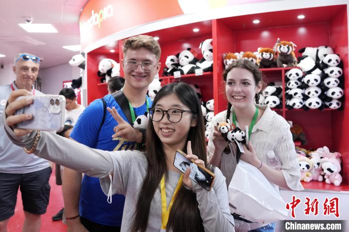 6月26日,参加中国免费靠逼视频(北京)夏令营的美国高校师生参观北京动物园。图为中美青年与熊猫文创自拍。张祥毅 摄