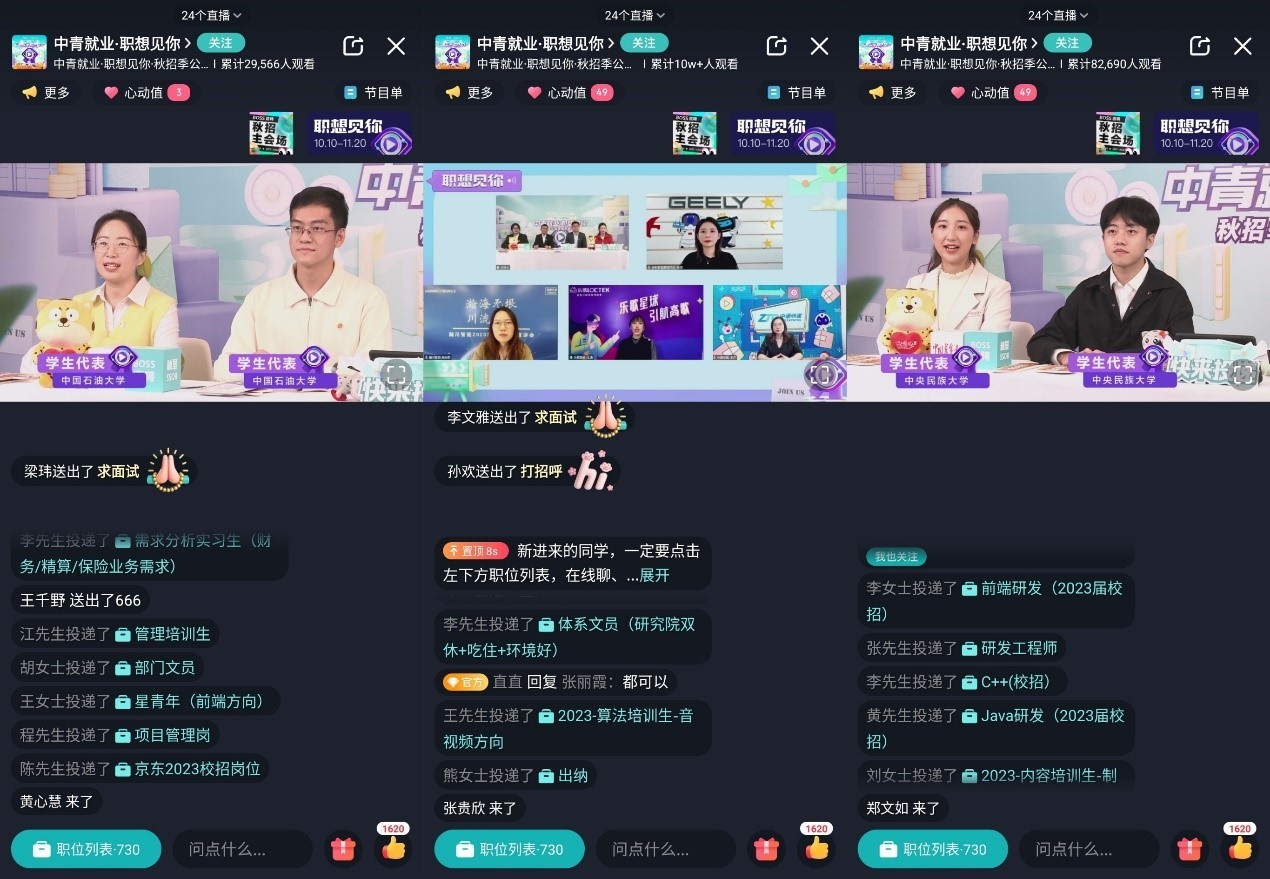 为促进大学生高质量就业,中国青年报联合BOSS直聘于10月11日推出“中青就业”秋招季公益直播带岗活动——“中青就业·职想见你”。