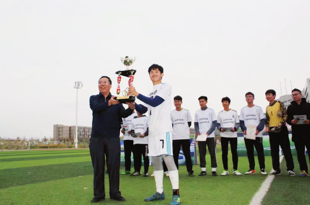魏鹏飞(前排右)在克拉玛依校区2018年第三届足球赛中夺冠,石油学院院长谢庆宾为其颁发奖杯