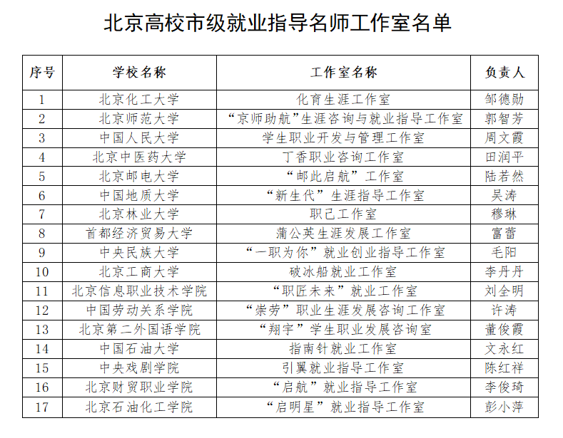 北京市级就业指导名师工作室“上新”。11月21日,记者从北京市教委官网获悉,北京化工大学化育生涯工作室等17家工作室被评为市级就业指导名师工作室。