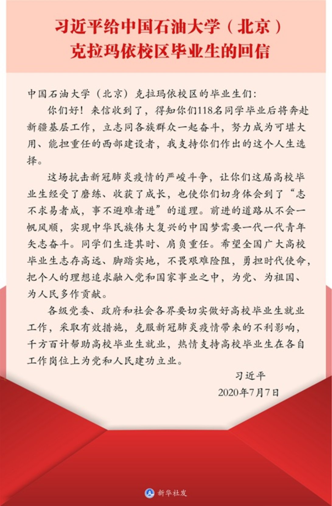2020年7月7日,总书记在回信中说,得知你们118名同学毕业后将奔赴新疆基层工作,立志同各族群众一起奋斗,努力成为可堪大用、能担重任的西部建设者,我支持你们作出的这个人生选择。