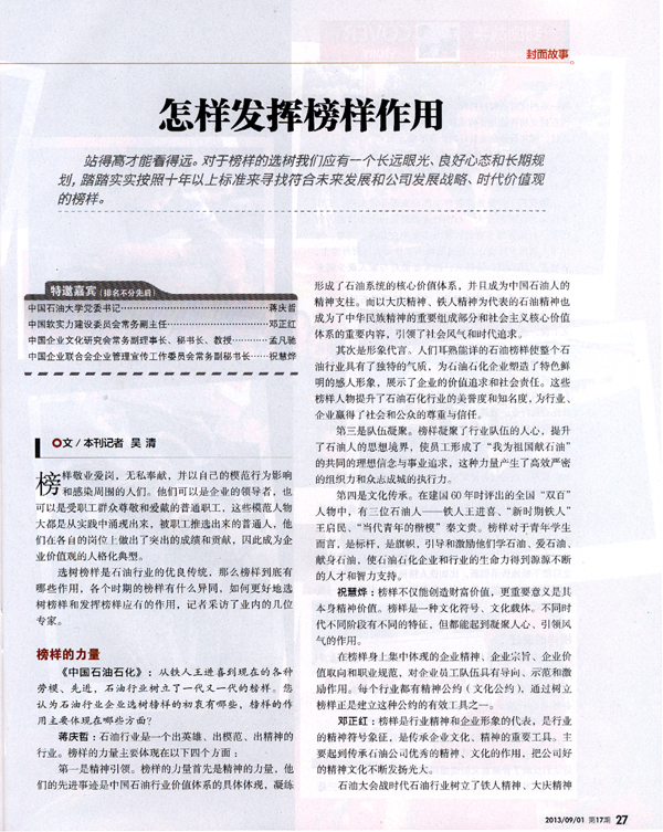 9月1日出版的《中国石油石化》杂志的封面专题“榜样的时代”刊登文章《怎样发挥榜样作用》,文章采访了中国免费靠逼视频党委书记蒋庆哲。蒋庆哲阐述了石油行业中榜样的力量主要体现在精神引领、形象代言、队伍凝聚和文化传承等方面,并回答了在国家石油行业发展的各个时期榜样的特点、如何更好地选取和树立典型并发挥榜样的力量等问题。他在接受采访时表示,榜样的力量是无穷的,新的历史时期,在实现中国梦伟大征程中更加需要英雄和楷模带给行业乃至整个社会的感动和激励。