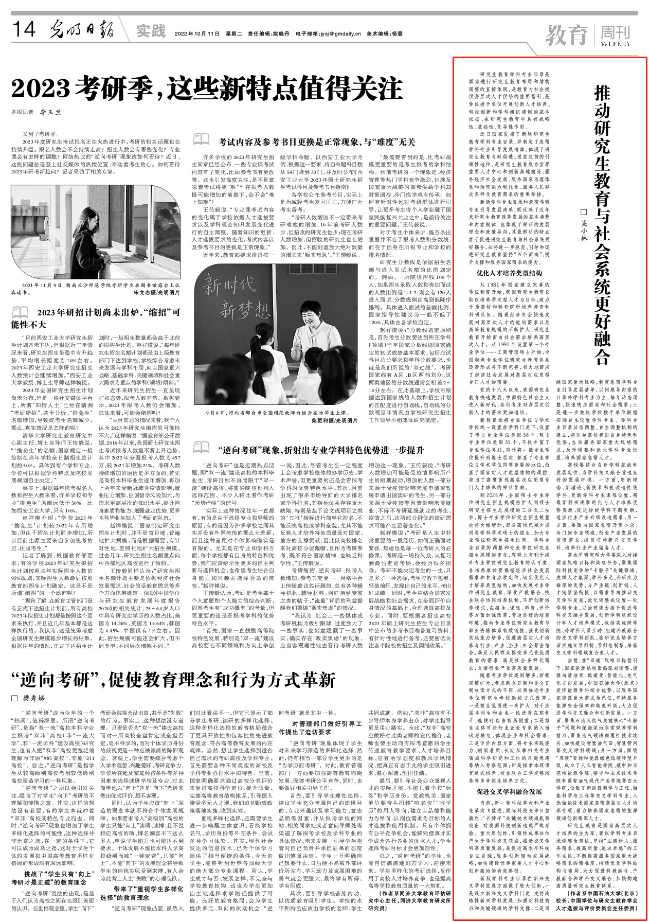 校长吴小林光明日报刊文:推动研究生教育与社会系统更好融合