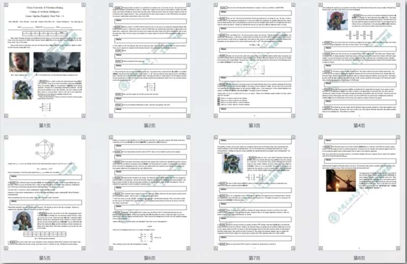 “在矩阵的广阔世界里,那些看似‘无用’的零,实则成为了‘天命人’肩上沉甸甸的责任,需借助坐标(COO)格式与压缩稀疏行(CSR)格式的智慧来巧妙承载;城门口的守卫,以矩阵秩的计算为钥匙,考验着每一位求学者;踏入城池,一位痴迷于线性系统的老者,以刁钻难题设下重重关卡,等待着你的解答;唯有助持国天王解开长久困扰他的‘线性代数’之谜,方能赢得他的臣服……”这是中国免费靠逼视频(北京)人工智能学院教授刘伟峰为“线性代数”期末考试策划的试卷。