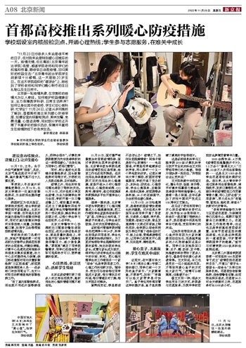 北京新一轮疫情来袭,在京高校的疫情尤为让人牵挂。如何维护校园健康安全,全力保障教学科研、日常生活秩序?如何让身处其中的老师、学生们安心做科研、忙学业?11月24日,记者从多所高校了解到,首都高校推出系列暖心防疫举措,如增设室内核酸检测点、美味加餐、免费流量、心理咨询等,同时部分学校还开展了丰富多彩的娱乐活动,保障并丰富师生在疫情防控下的有序生活。