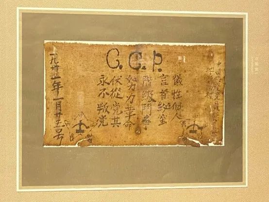 革命理想高于天”。展馆里有一幅泛黄的粗布,上写着“C.C.P”和“牺牲个人”24字入党誓词,字迹不算工整,甚至还有错别字,却吸引了同学们驻足。“这是迄今为止保留下来最早的中国共产党人入党誓词。”讲解员向同学们介绍,1931年1月25日,永新县北田村农民贺页朵在自家榨油坊正式宣誓加入中国共产党,他激动地将宣誓词写在一块红布上表达自己的决心。红军长征后,贺页朵身负重伤,留在老家坚持斗争,他将这块写有入党誓词的红布用油纸包好,藏在榨油坊屋檐下。新中国成立后,这幅红布被捐献给文物部门。“它展示了农民党员对党的热爱之心和对革命的坚定信念。”