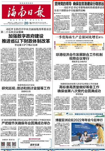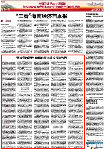 海南日报:坚持党的领导 确保自贸港建设行稳致远