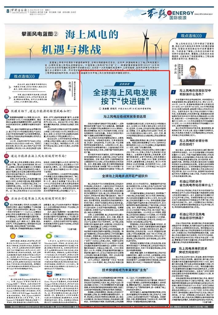 海上风能被公认为实现能源转型与碳中和的重要载体,但其未来发展还面临诸多挑战。尽管海上风电技术已经取得巨大进步,海上风电产业进入快速发展期,但未来三十年仍然需要前所未有的部署规模,其未来发展仍面临加快突破技术瓶颈、加速工业供应链可持续发展以及降低成本等多方面挑战。