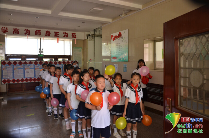 图为志愿者组织同学们走出校园,参观东北抗日联军博物馆与五大连池世界地质公园火山博物馆,同学们开心地手持气球,安静等待大巴的到来。中国青年网通讯员 何天 供图
