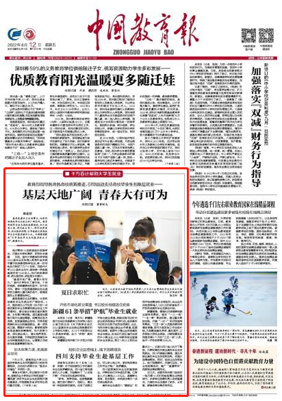 中国教育报:教育部指导各地各高校统筹推进,引导鼓励支持高校毕业生到基层就业—— 基层天地广阔 青春大有可为