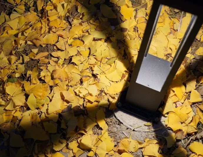 穿过校园的树林洒在金黄的落叶上