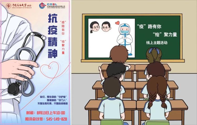 8月13日,双方合作举办“‘疫’路有你,‘绘’聚力量”线上主题活动,通过讲述抗疫故事、分享志愿经历、“大白”绘画教学,让中国海油COSL河北训口希望小学的孩子们深刻学习领会抗疫精神,“云课堂”取得了良好的教学效果,在炎炎夏日里为孩子们的假期送去了知识,增添了快乐。