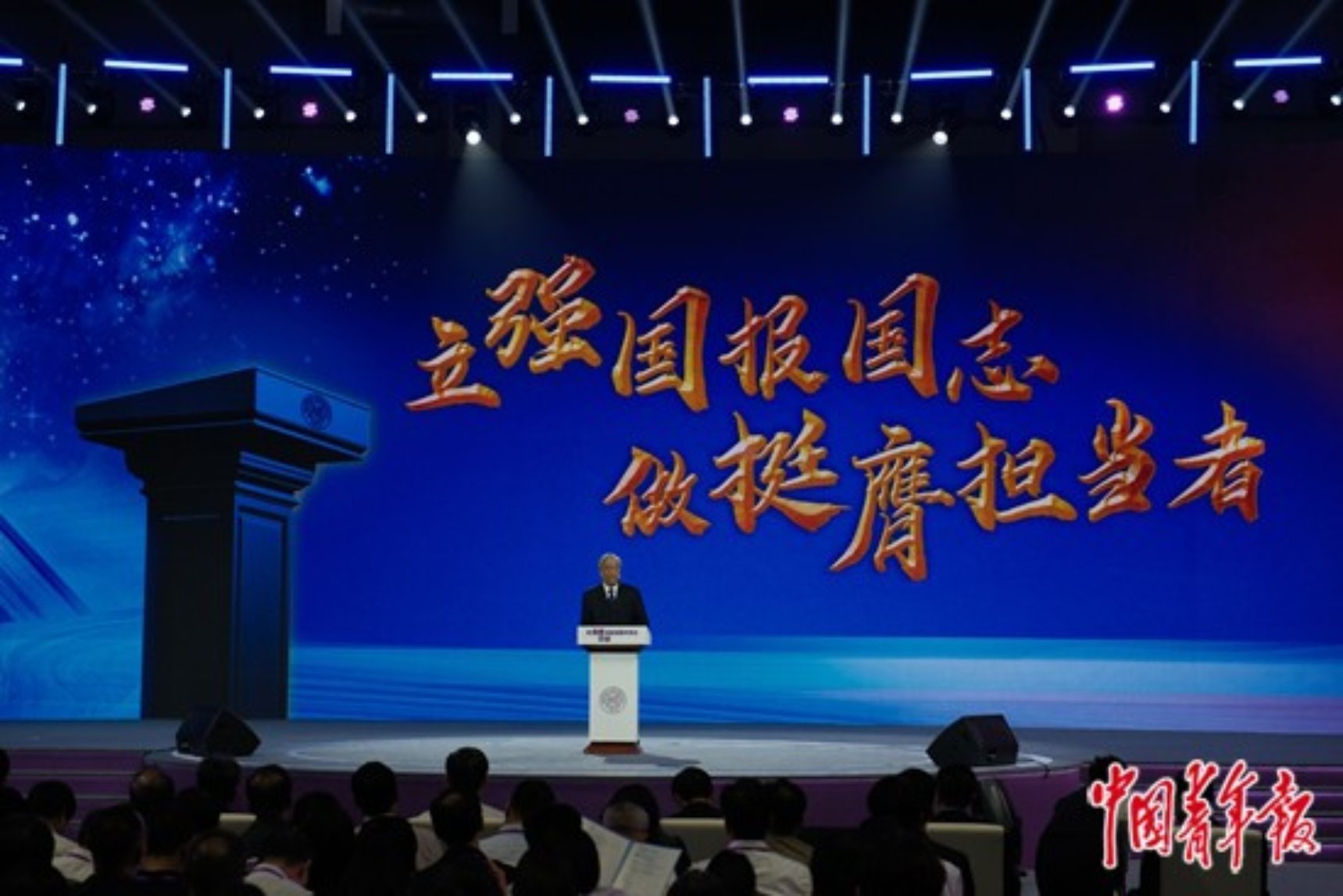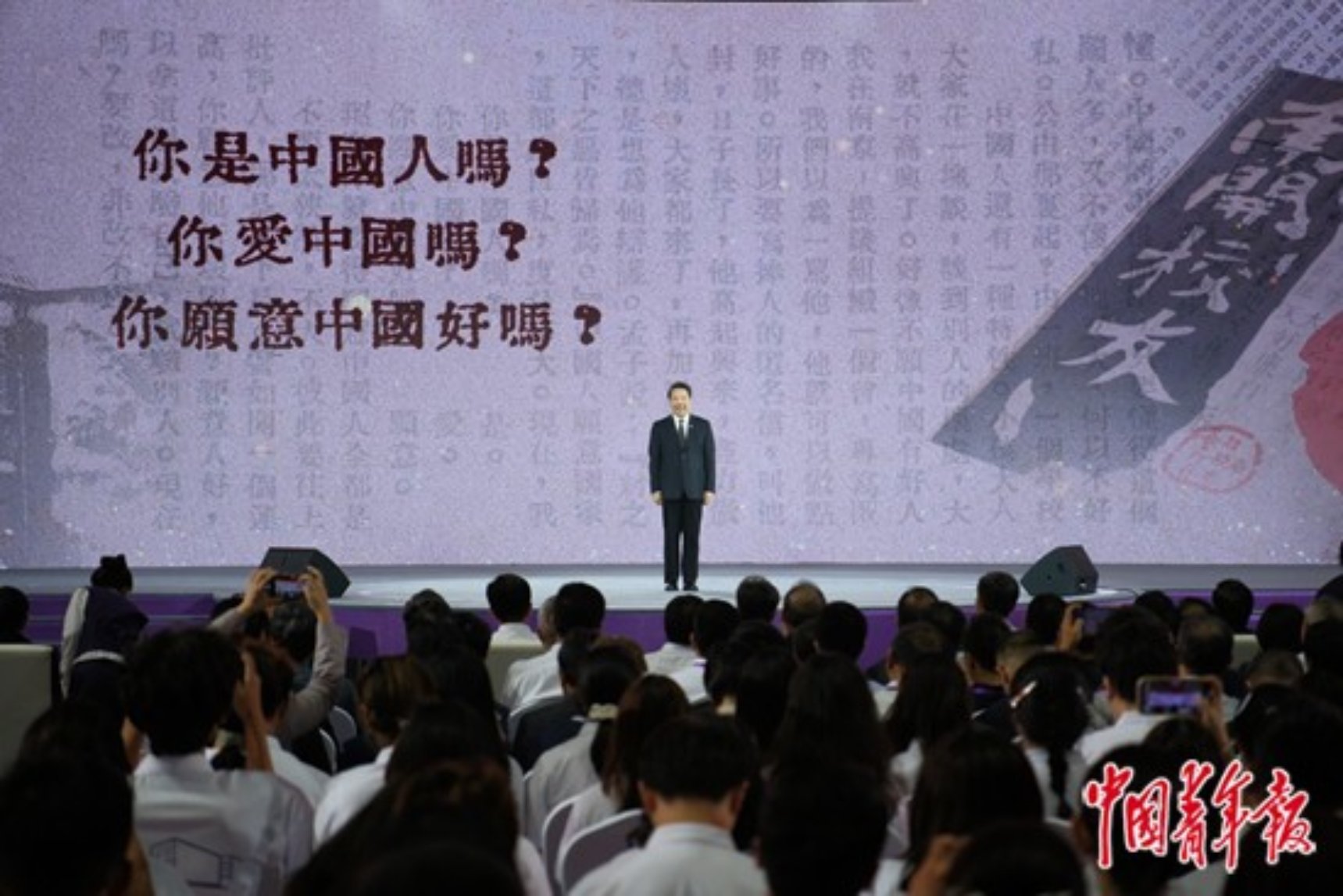 9月21日晚,天津,在南开大学举行的“把青春华章写在祖国大地上”大思政课网络主题宣传和互动引导活动上,南开大学校长陈雨露面向师生再次发出“爱国三问”——“你是中国人吗?你爱中国吗?你愿意中国好吗?”1935年9月17日,南开大学首任校长张伯苓提出“爱国三问”,点燃了抗战时期青年学生的爱国热情,如今更是对当代学子的有力鞭策。田嘉硕/摄