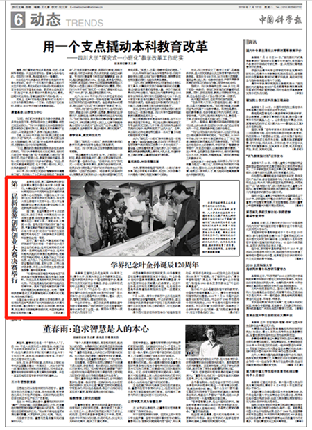 7月17日出版的《中国科学报》第6版以“第二届新能源创新创业大赛决赛举行”