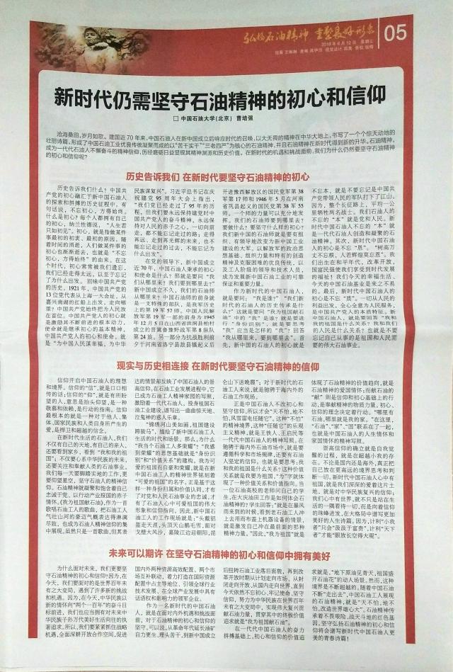 6月12日,石油商报第5版刊登了石大马克思主义学院教师曹培强撰写的题为《新时代仍需要坚守石油精神的初心和信仰》的文章。文章通过分析历史、结合现实深入解读了为什么在新时代的机遇和挑战下我们仍要坚守石油精神的初心和信仰,认为石油精神传承着不畏艰险、战天斗地的红色基因,坚守弘扬石油精神的初心和信仰将会谱写新时代中国石油人更美的青春诗篇。