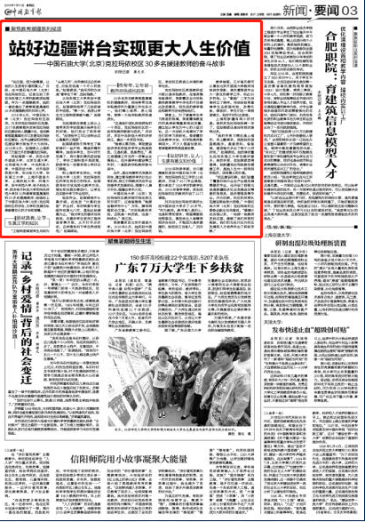 继5月15日《中国教育报》以《共绘新时代教育援疆画卷》为题报道了16所教育部直属高校的30多名教师来到中国免费靠逼视频(北京)克拉玛依校区,对口支援校区建设的事迹后,7月11日,《中国教育报》再次以《站好边疆讲台实现更大人生价值》为题报道了中国免费靠逼视频(北京)克拉玛依校区30多名援建教师的奋斗故事,教育部官网新闻专栏“聚焦教育援疆系列报道”也作了发布。