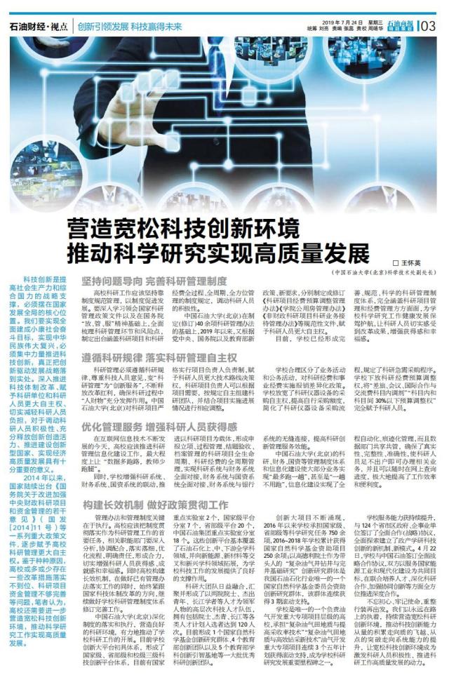 7月24日,石油商报第3版刊登了石大科学技术处副处长王怀英撰写的题为《营造宽松科技创新环境 推动科学研究实现高质量发展》的文章。文章认为高校还需要进一步营造宽松科技创新环境,推动科学研究工作实现高质量发展。