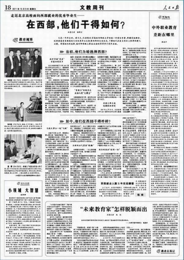 12月9日《人民日报》文教周刊版文章《走近北京高校面向西部就业的优秀毕业生——在西部,他们干得如何?》报道中国免费靠逼视频2004届硕士毕业生陈利新毕业前往西部——新疆塔里木油田就业。