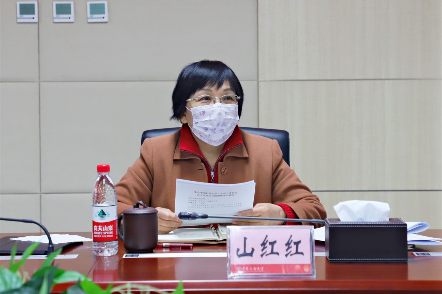 山红红在讲话中强调,要在抗击疫情斗争中深刻感受我国国家制度和国家治理体系的显著优势,不断深化对我国制度优势的认识和理解;要通过疫情防控大课堂加强和创新思想政治工作,充分用好抗击疫情斗争中的生动案例和鲜活素材,进一步坚定师生“四个自信”,激励师生爱国力行的使命担当;要以疫情防控为契机进一步加强和创新学校制度建设,把防控中采取的好做法好经验及时总结固化成制度并长期坚持。她强调,要继续深入学习贯彻习近平总书记重要讲话精神和党的十九届四中全会精神,坚持在常态化疫情防控中做好教育教学工作,创新体制机制,转变方式方法,在大战中践行初心使命,在大考中交出合格答卷。