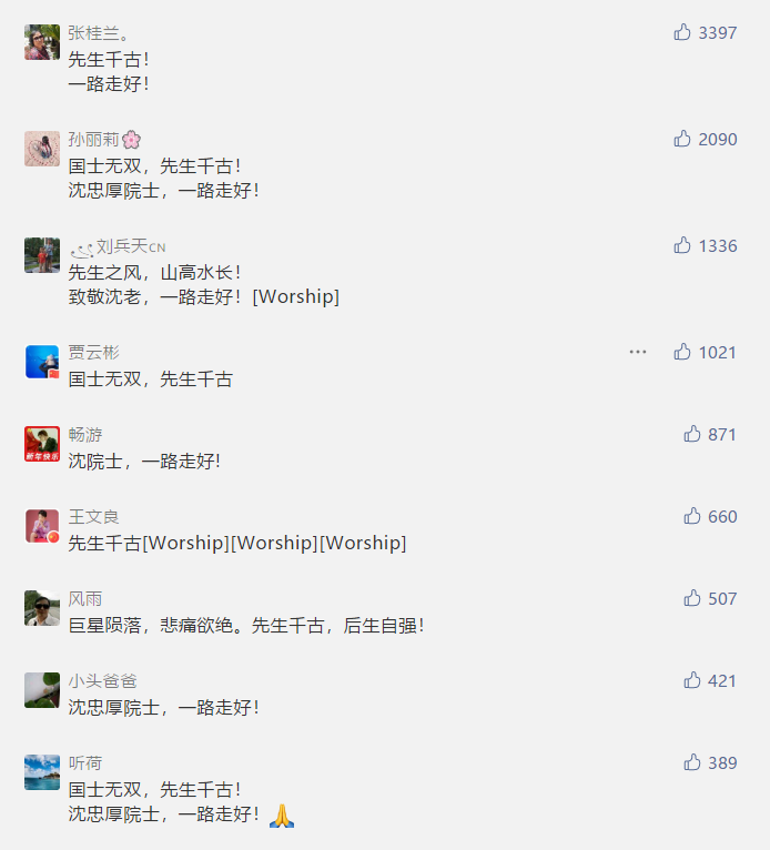 沈忠厚院士逝世后,党和国家领导人、中央和国家相关部门领导、北京市和山东省相关部门领导、石油石化企业领导,广大师生校友、社会各界人士和沈忠厚院士生前友好通过多种方式表达沉痛哀悼和深切缅怀。