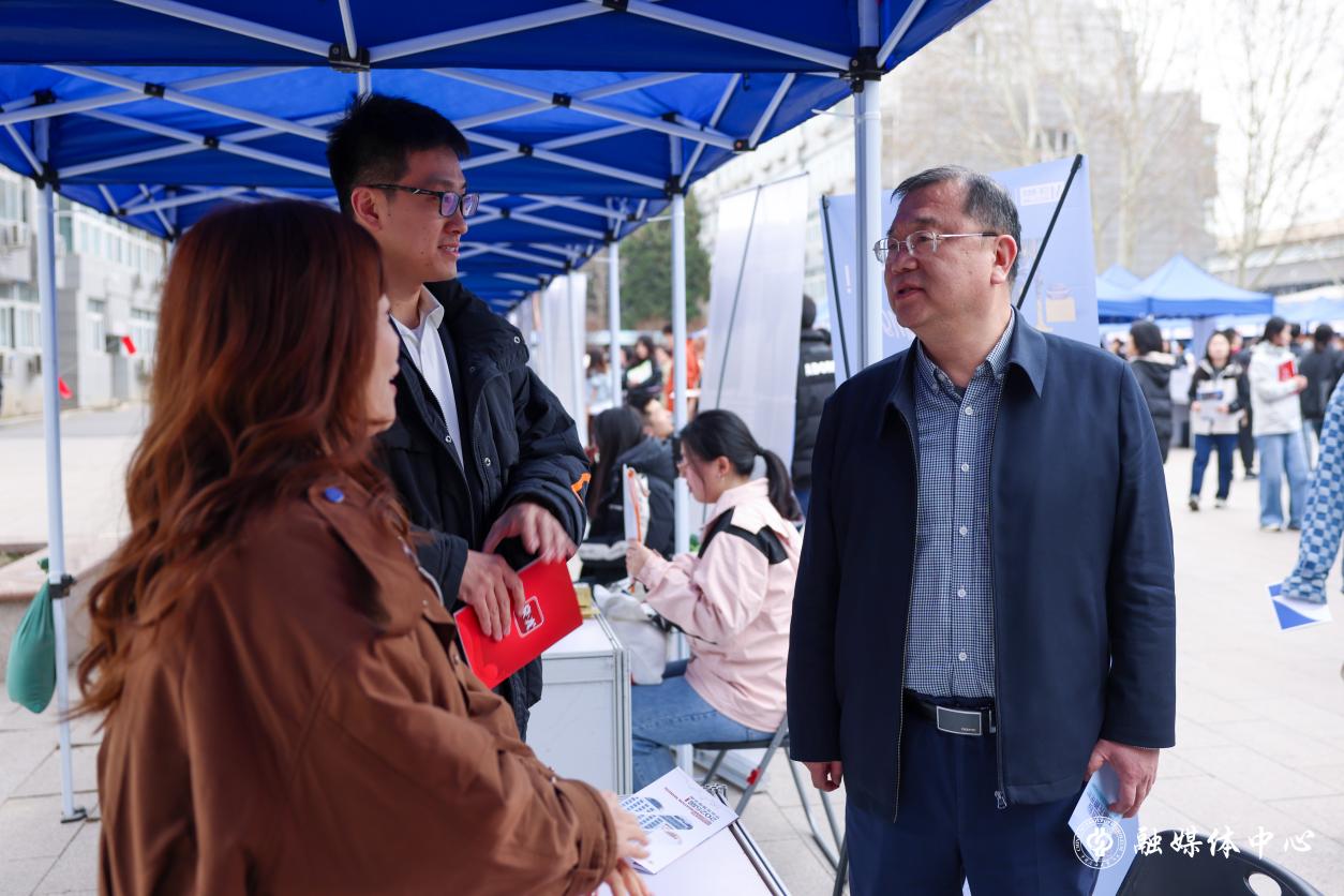 双选会期间,学校党委常委、副校长黄磊来到招聘会现场,看望招聘单位代表与求职毕业生,了解招聘单位用人需求,鼓励毕业生把握机会、积极求职。