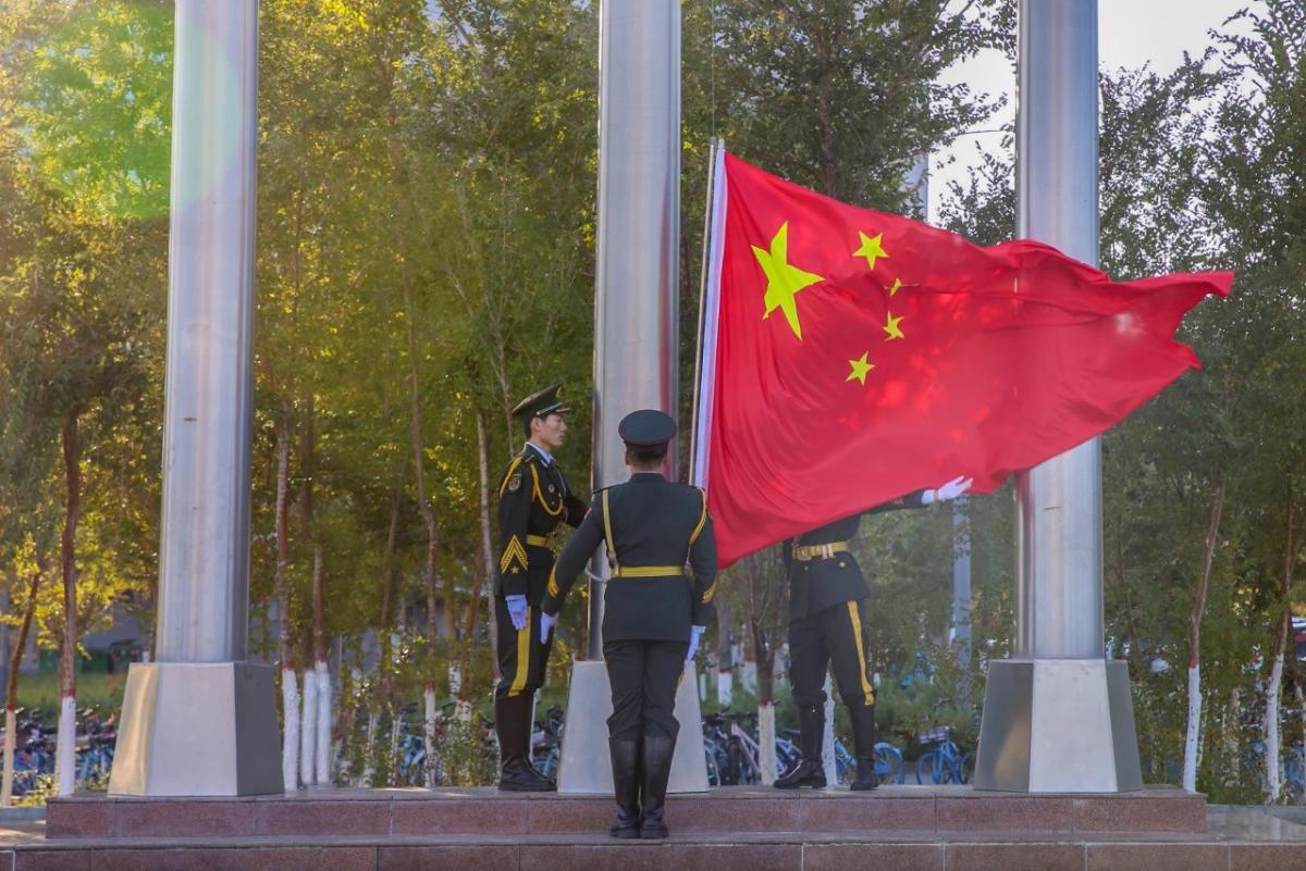 克拉玛依校区也在红旗操场举行了国庆升旗仪式,全体在校新生和辅导员参加活动,高唱雄壮的国歌旋律,诵读爱国诗篇《我的祖国》,活动现场涌动着澎湃的爱国热情。