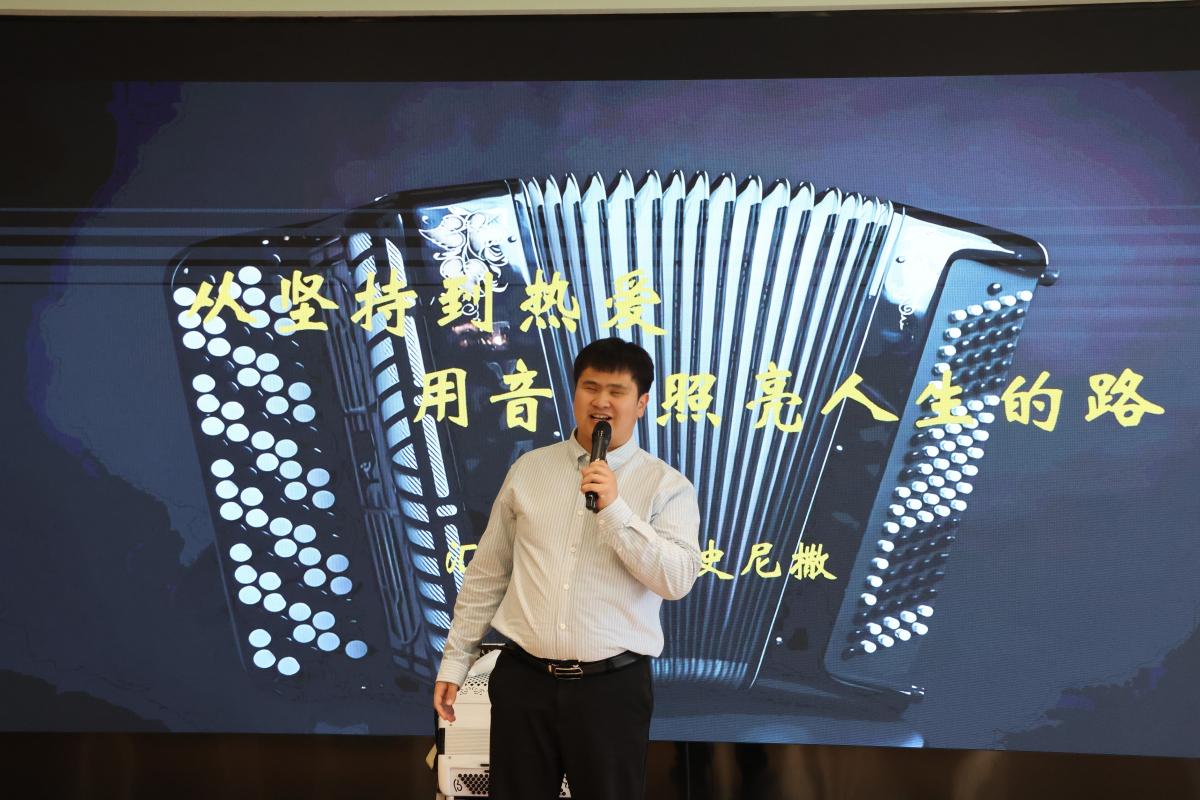 博史尼撒是一名彝族小伙,是四川残疾人艺术团成员。他以幽默诙谐的方式,讲述自己残疾后不断突破自我的经历。上天夺走了他的双眼,同时也赐予了他灵活的双手。他在失败中尝试,在挫折中坚持,通过手风琴艺术走向更广阔的天地。他希望那些同他一样身处黑暗的人在热爱中汲取能量,勇敢地追逐梦想之光。宣讲最后,他还为师生们带来手风琴独奏《我为祖国献石油》。