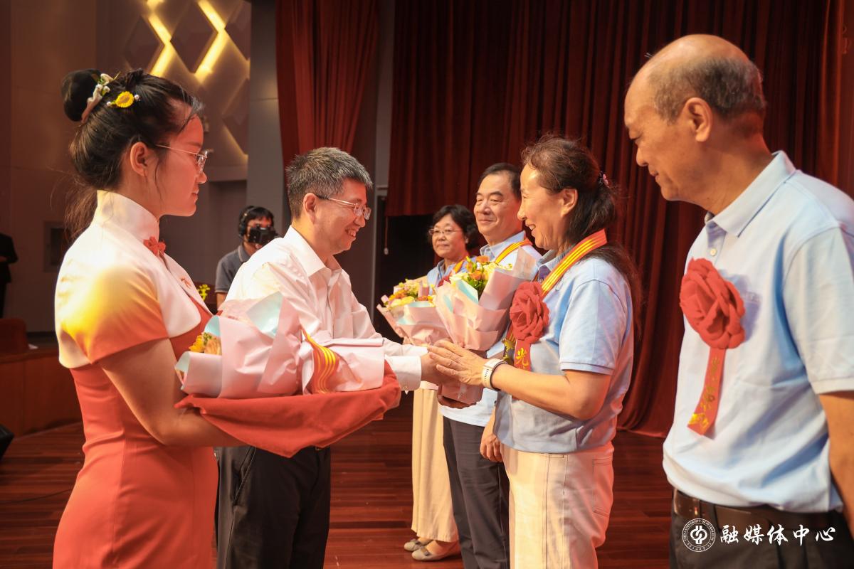 荣休典礼上,金衍为荣休教师代表颁发纪念奖章,镌刻每位教师姓名及在校年限的奖章,凝结着学校对他们躬耕教坛、爱岗敬业、默默奉献的致敬和美好祝福。