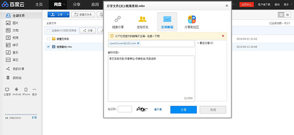 2)非文字类作品由于容量较大,可将作品于2016515前上传至百度网盘,分享链接到邮箱,具体分享操作步骤见附件。