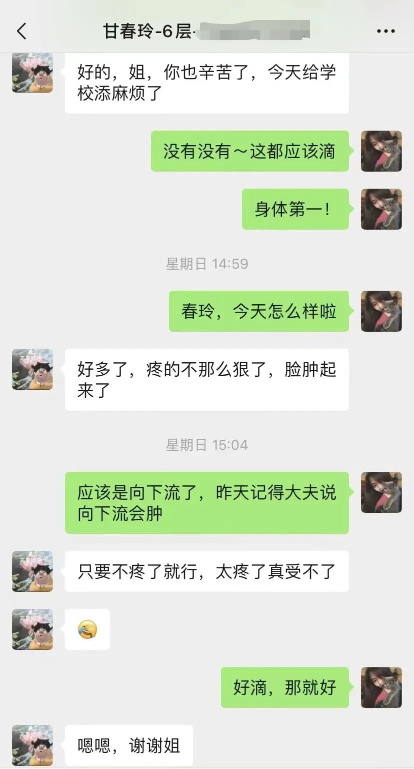 校医院院长沈晓峰立刻与周边医院联系,最终联系到昌平区医院急诊,学校第一时间安排好转诊车辆闭环接送。因为牙髓炎状况十分严重,甘春玲在车上忍不住啜泣,陪同就诊的陈楠老师和司机一起安慰鼓励。在医院就诊时,医生强调注射药物后不能空腹,陈楠帮学生垫付药费取药后,又跑到医院的食品部买来了热牛奶和面包。在听医嘱的时候甘春玲又哭了,医生问她:“是不是哪里不舒服?”她说:“我第一次离家这么远,一开始哭,是因为牙疼,后来,是被那么多人关心,感动。”