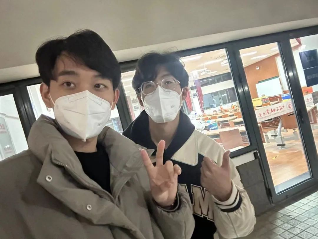 两兄弟穿着大白,和两位志愿者一起配送早饭、组织转运、配送午餐、搬运物资、配送晚餐,直到最后一位同学吃上饭,俩人才顾不得形象,累得一屁股坐下。汗水氤氲模糊了面罩,一天水米未进的胃,阵阵绞痛。