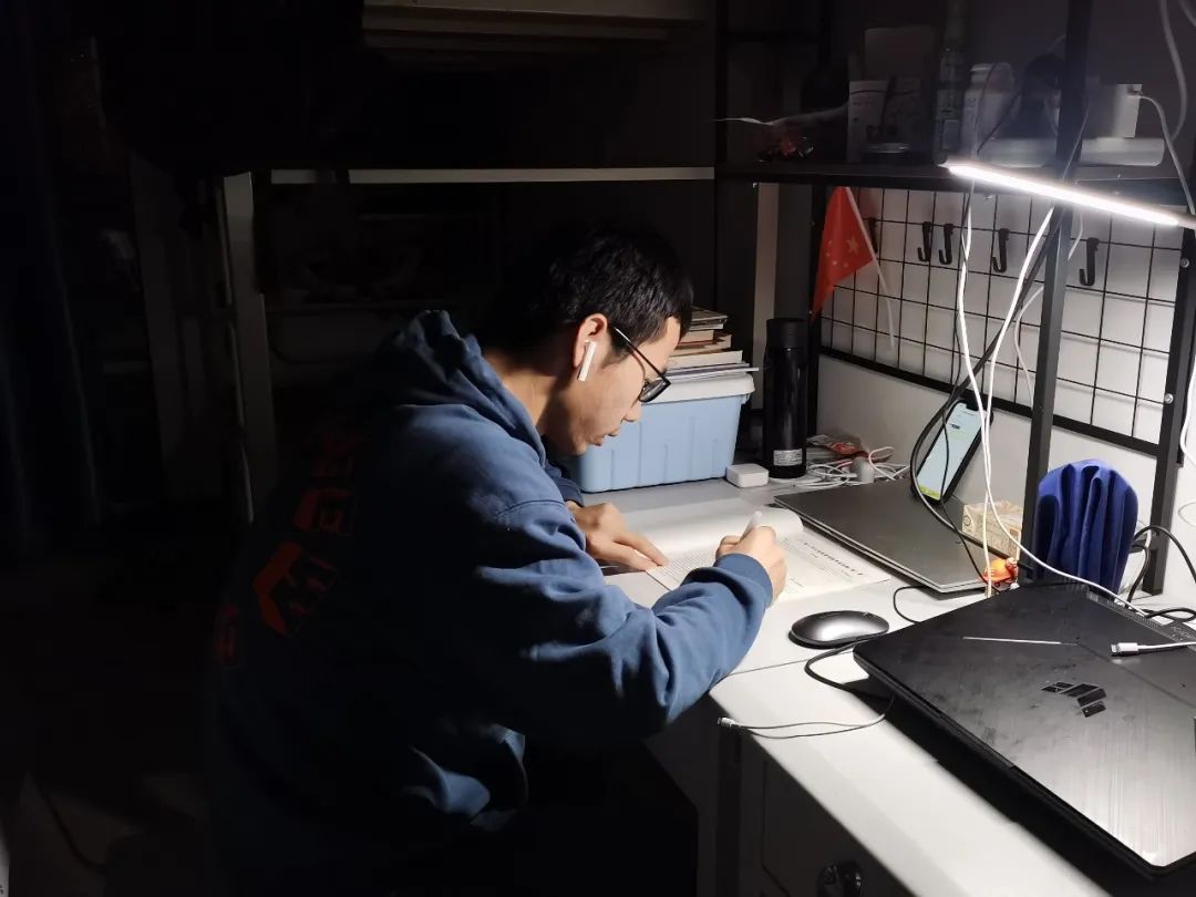 天刚蒙蒙亮,经济管理学院的王宏达就开启了一天的学习生活。他戴着降噪耳机,在宿舍最安静角落的台灯下沉浸学习。王宏达曾是新疆博尔塔拉职业技术学院的一名老师,他非常珍惜来到中石大读研的机会,认真听好每一节课,做好每一页笔记,平时也经常给舍友讲解题目,是名副其实的“王老师”。