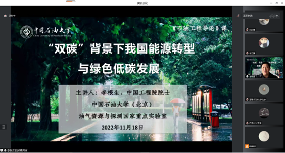 李根生院士以“双碳背景下我国能源转型与绿色低碳发展”为主题,着重介绍了我国能源转型与结构调整的主要方向,对“双碳”目标下的油气发展战略路径和举措进行了深入解读,强调了油气在未来能源结构中的战略地位,激励同学们明确专业目标,树立远大理想。