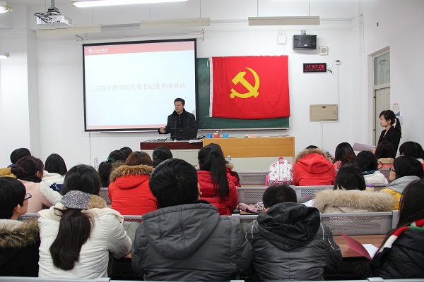 12月8日晚,石大工商管理学院在三教301举行了工商管理学院学习十八届四中全会精神总结会暨2013-2014年度优秀党员支部、优秀共产党员表彰大会。工商管理学院党委书记董秀成老师、党委副书记罗晓燕出席了会议,50余名学生党员代表参加了大会。
