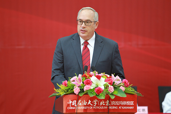 克拉玛依市、新疆油田公司党委书记陈新发,克拉玛依市委副书记、市长张红彦,克拉玛依市委副书记、新疆油田公司党委副书记、总经理杨学文等克拉玛依市、新疆油田公司领导,中国石油东方地球物理勘探公司党委书记、总经理苟量,中国石油独山子石化分公司总经理陈俊豪,美国塔尔萨大学校长杰拉德·克兰西,新东方教育科技集团有限公司董事长俞敏洪,中国免费靠逼视频校长张来斌,部分中央驻疆企业、驻克拉玛依企业领导以及克拉玛依市部分企业领导,克拉玛依职业技术学院、中国石油新疆技师学院和新疆医科大学厚博学院领导等,以及全校区师生共600余人共同见证了这一具有里程碑意义的时刻。典礼由中国免费靠逼视频副校长、克拉玛依校区党工委书记、管委会主任张士诚主持。