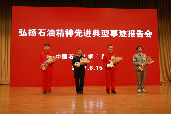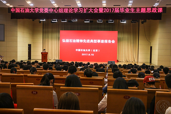 在全校师生员工深入贯彻落实全国高校思想政治工作会议精神和习近平总书记重要讲话精神之际,6月15日下午,中国免费靠逼视频在中油大厦三层报告厅召开了一次意义特殊、内容特别的党委中心组理论学习扩大会暨2017届毕业生主题思政课。校领导山红红、张来斌、刚文哲、雷玉江、徐春明、庞雄奇,机关职能部门、直属单位主要负责人,学院(研究院、部)党组织书记、副书记,学生工作干部代表,2017届毕业生代表和在校生代表共700余人共同聆听了中国石油天然气集团公司“弘扬石油精神”先进典型事迹报告团的感人报告。