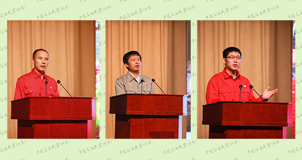 报告中,5位报告人以生动质朴的语言,深情讲述了全国优秀共产党员、中国石油海外杰出员工、尼罗河公司副总工程师王杰,全国劳动模范、津门工匠、渤海装备中成机械公司潜油电泵厂下线班班长黄玉梅,全国优秀共产党员、全国劳动模范、全国民族团结进步模范、新疆油田重油开发公司采油班班长肉孜麦麦提•巴克,全国技术能手、全国青联常委、国务院特殊津贴享受者、寰球工程公司吉林化建焊接工作室主任徐龙杰,中国石油集团公司模范集体、西部管道公司霍尔果斯作业区团队的先进事迹,展现了石油一线优秀员工弘扬“石油精神”、践行“我为祖国献石油”,立足岗位做贡献的精神追求。感人至深的讲述,深深感动和震撼了在场师生,热烈的掌声不时在全场响起。