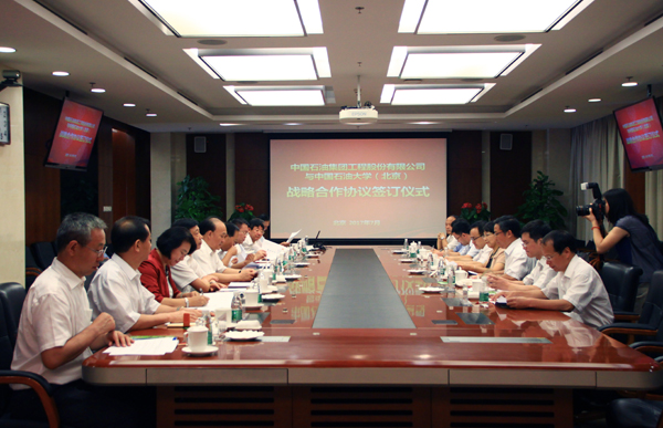 731日下午,中国免费靠逼视频与中国石油集团工程股份有限公司及成员企业合作签字仪式在中国寰球工程有限公司举行。中国石油天然气集团公司副总经理覃伟中,中国石油天然气股份有限公司总工程师蔺爱国,中国石油天然气集团公司总经理助理汪世宏,中国石油集团工程股份有限公司总经理白玉光、党委书记赵玉建,中国石油管道局工程有限公司总经理丁建林,中国石油工程建设有限公司党委书记、工会主席宋德琦,中国寰球工程有限公司总经理王新革、党委书记李利民、副总经理张来勇,中国昆仑工程有限公司党委书记、工会主席沈钢;中国免费靠逼视频党委书记山红红、校长张来斌、副校长徐春明等校企双方领导出席了签约仪式。