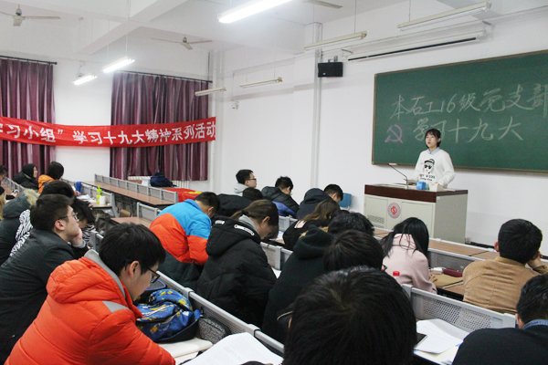 各单位还开展了形式多样、内容丰富的活动。地球物理与信息工程学院开展教师与学生寝室结对子活动,学院教师付建伟、谢豪走进学生宿舍,向学生宣讲十九大精神,与学生谈心,对学生进行学业指导,作学生思想上、学习上、行动上的领路人;马克思主义学院举办“十九大精神进课堂”蓝墨云示范课,理学院党委副书记杨东杰分享了他在教学中运用蓝墨云的经验,介绍了如何利用蓝墨云进行课程创建、课堂管理、班级分组讨论、资源推送与分享等。石油工程学院2017级研究生各党支部共同举办了学生党建“六个一”工程之“学思践悟十九大”特色活动暨十二月创新组织生活会,石工2016级本科党支部举行了学习十九大精神读书报告分享会,支部成员畅谈了学习十九大精神的体会和感想。