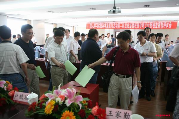 6月22日,我校召开深入学习实践科学发展观活动分析检查阶段总结暨校领导班子分析检查报告评议大会,校党委书记蒋庆哲向与会代表介绍了分析检查报告的形成过程及主要内容,并部署了学习实践活动第三阶段,即整改落实阶段的主要工作。部属高校深入学习实践活动领导小组第二指导检查工作组组长、四川大学原党委书记卢铁城,副组长、江南大学原校长陶文沂,指导检查工作组联络员王家勤,全体校领导,以及全体二级干部,党委委员、纪委委员,教代会主席团成员,校学术委员代表,各民主党派负责人,离退休教职工代表,学生党员代表出席了会议。会议由校长张来斌主持。