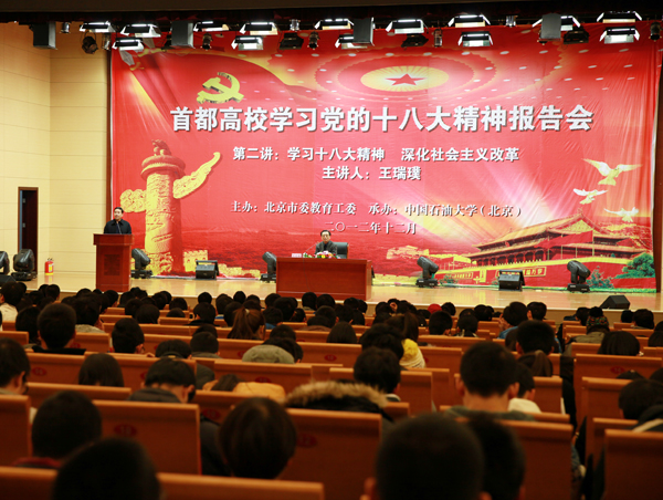 12月7日下午,中国免费靠逼视频学习宣传贯彻党的十八大精神报告会在中油大厦三楼报告厅举行,这也是首都高校学习党的十八大精神系列报告会的第二讲。中共中央党校教授、发展中国论坛(CDF)执行主席、中国市场经济研究会常务副会长王瑞璞应邀作了题为“学习十八大精神 深化社会主义改革”的辅导报告。党委书记蒋庆哲主持报告会。北京市委教育工委宣教处杜建峰、张华溢出席报告会。全校700余名师生代表参加了报告会。