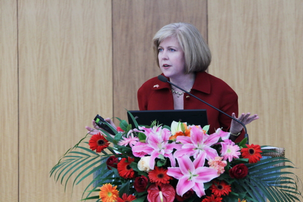 Cheryl Matherly应邀作了以“高等教育国际化:美国案例研究”为主题的报告,她从学术研究、实践经验两个角度简要介绍了美国高等教育国际化的概念、发展趋势,以及图尔萨大学国际化发展的历程与成果。