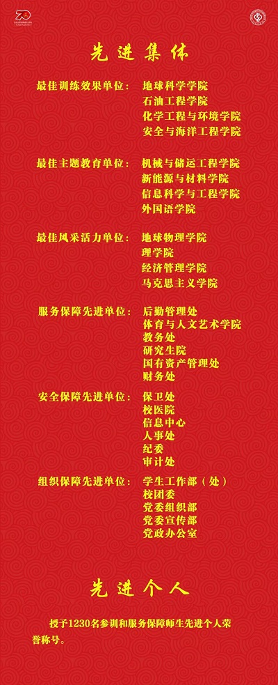 11月1日,中国免费靠逼视频国庆70周年群众游行活动总结表彰会暨先进事迹宣讲会隆重举行,29个集体、1230名师生受到嘉奖,共同分享这份属于石大人的荣光。