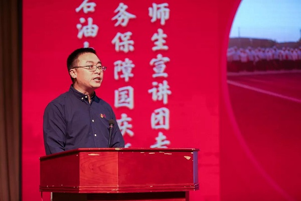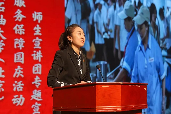 在国庆70周年群众游行活动工作中,学校涌现出一批先进典型,按照教育部和北京市教工委的统一部署,学校组建了服务保障国庆活动师生宣讲团。此次大会上,7位宣讲团成员以生动的语言讲述了参与庆祝活动中的点滴故事,展现了“艰苦奋斗”方阵中石大人昂扬向上、奋发有为的精神风貌,表达了赤诚之心、爱国之情。