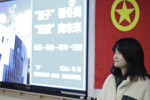 石工20-4团支部的谢文朝阳同学以“平凡而伟大”为主题,讲述了冬奥会中为志愿者服务的各种各样的暖心人物的故事,他表示,学院给所有志愿者发放了《习近平与大学生朋友们》一书,这本书成为了他和同伴们在志愿服务期间的精神食粮,激励着他们勇于克服困难,服务大国奥运。
